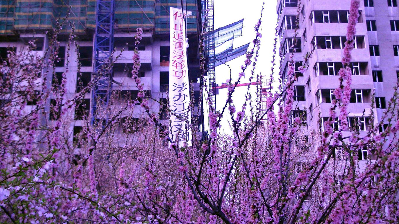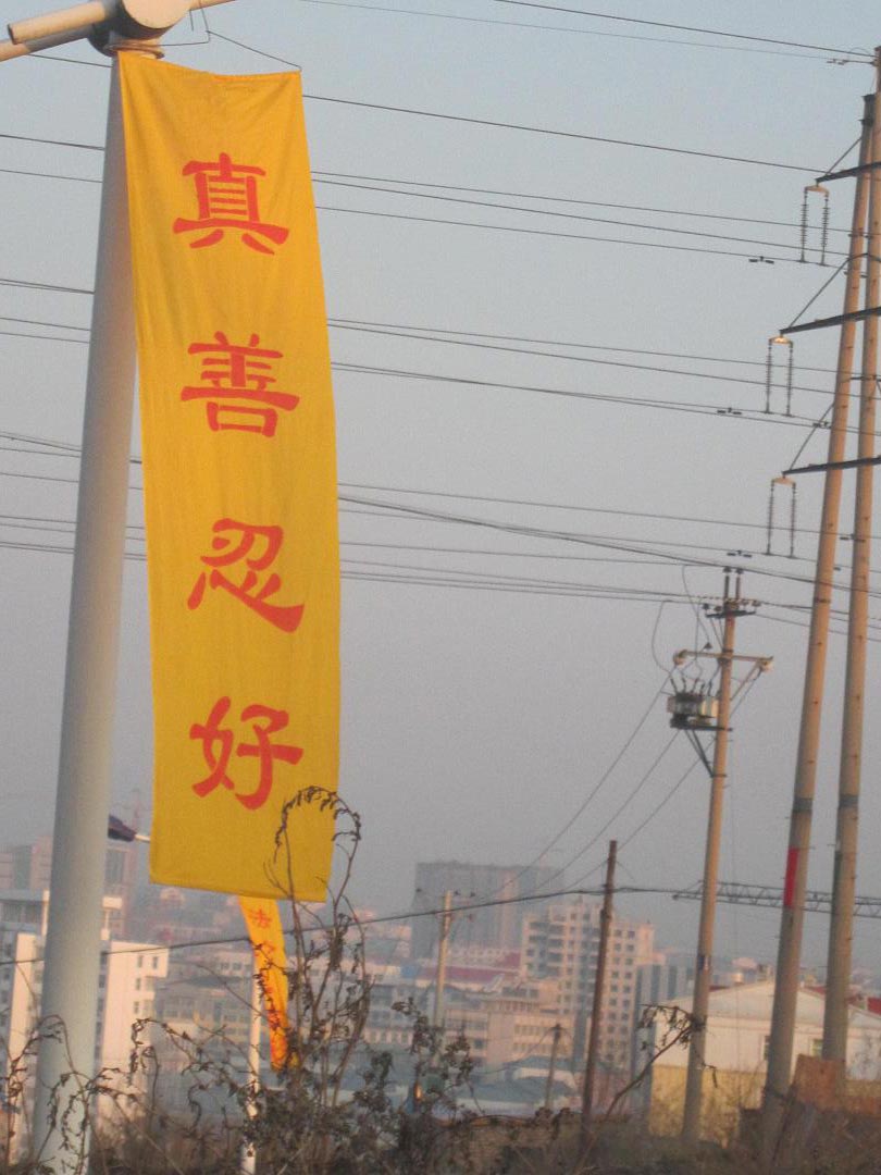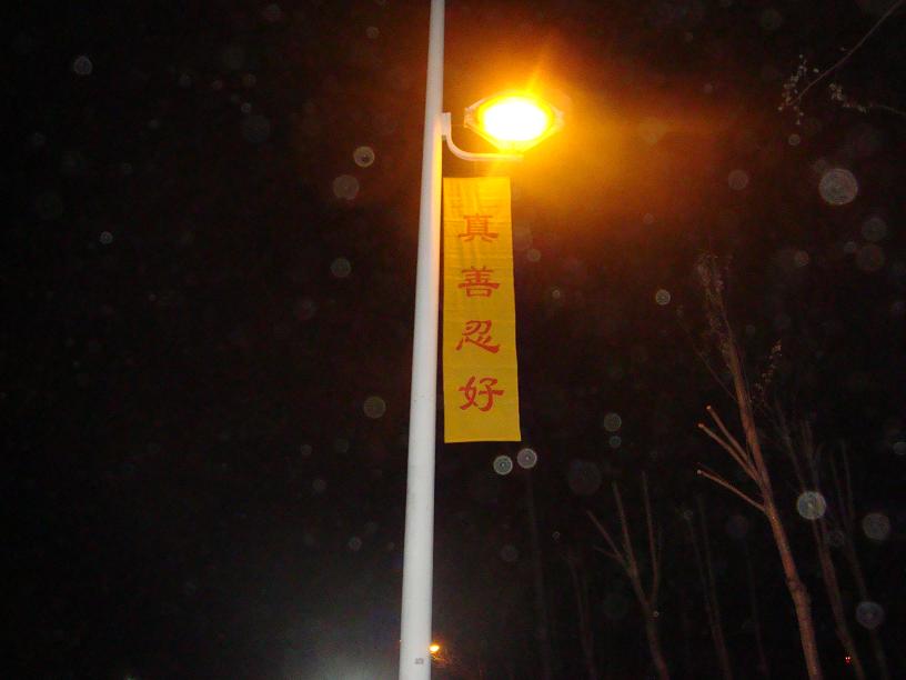 黑龙江省鸡西市大法弟子在各处街道、居民区悬挂“法轮大法好”“真善忍好”条幅,庆祝大法洪传二十周年。