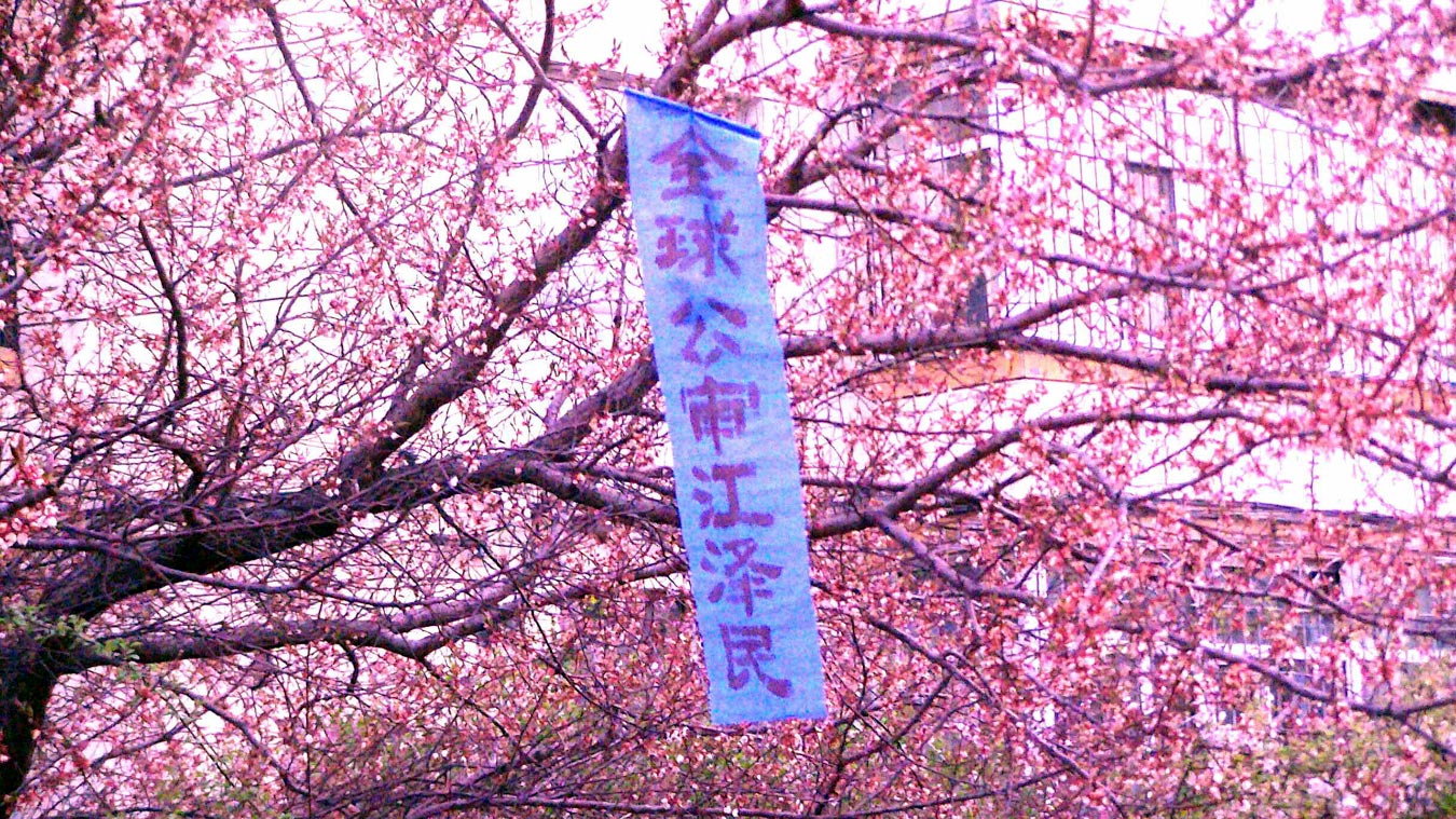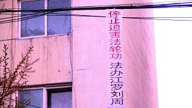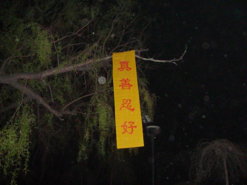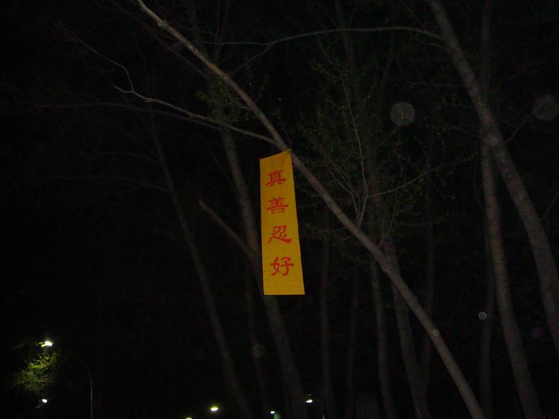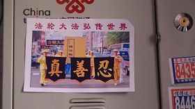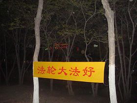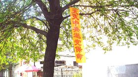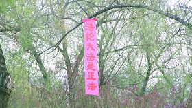 五月十三日是世界法轮大法日,今年的五月十三日标志着法轮大法洪传于世二十周年,大陆大法弟子以各种方式纪念这个神圣而庄严的日子,东北某市公园、路边和住宅小区内出现大量的真相条幅和不干胶贴。引来众多民众驻足观看,多数人一边绘声绘色的念着条幅上的每一个字,一边发出不同以往的感叹,“法轮功了不起!”特别是对于“法办江罗刘周”的条幅,更是倍感兴致。有的还故意询问“这几个人是谁呀”,有的在回答问题。真的会感到环境在变,世人在觉醒。