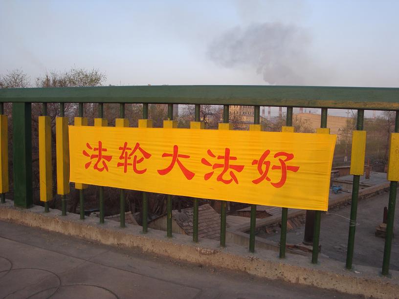 黑龙江省鸡西市大法弟子悬挂条幅庆大法日