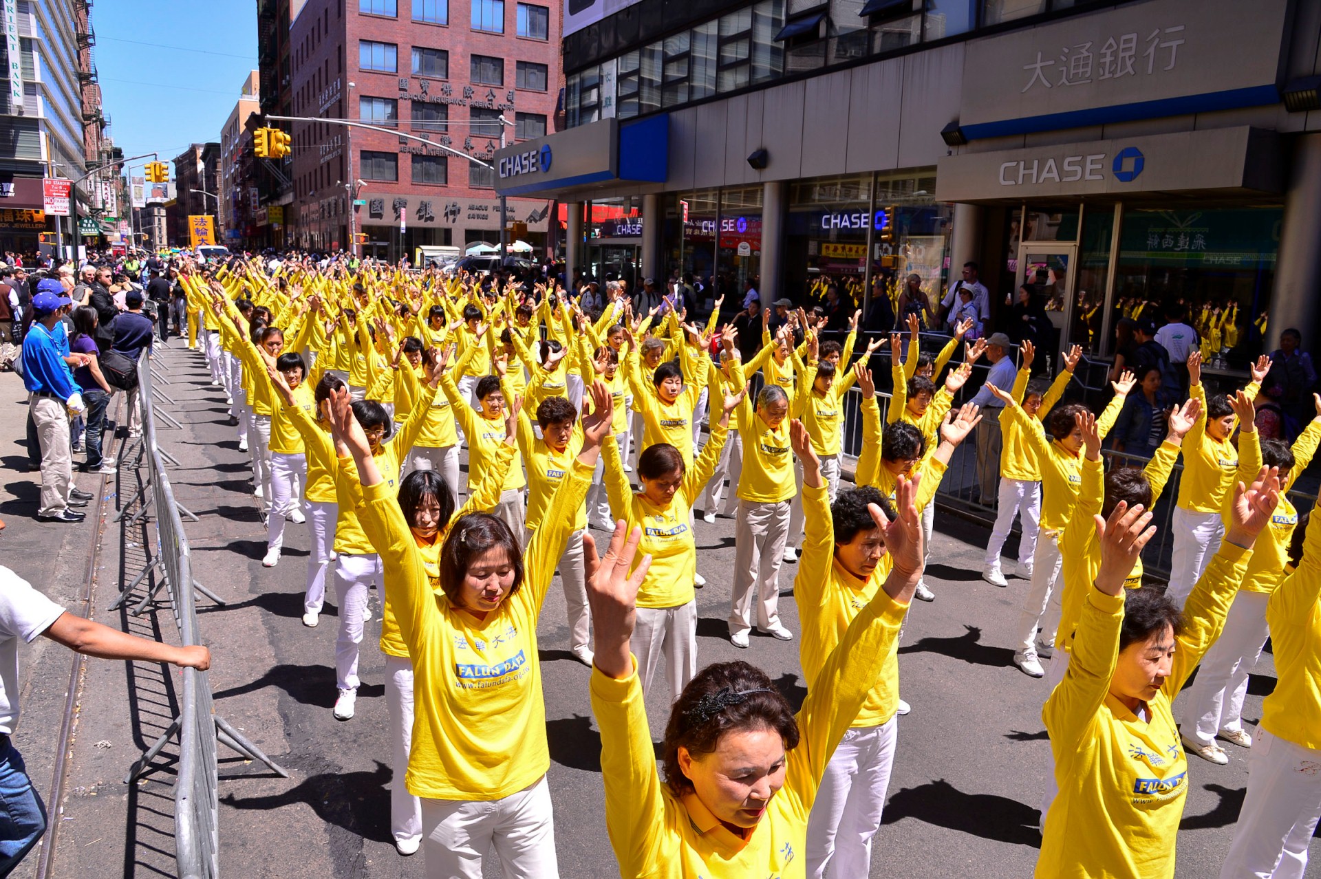 盛大游行队伍由三百多名法轮功学员组成的天国乐团开道,雄壮的《法轮大法好》、《法鼓法号震十方》、《法正乾坤》、《送宝》和《法轮圣王》等曲目震撼人心。巨大的法轮功书籍的模型在阳光下熠熠发光,身着仙女装的仙女队飘然而至,犹如步入仙境,舞狮舞龙队喜庆吉祥。由台湾法轮功学员组成的庞大的炼功方阵,向人们演示着法轮功的功法,整齐祥和,宁静超然。