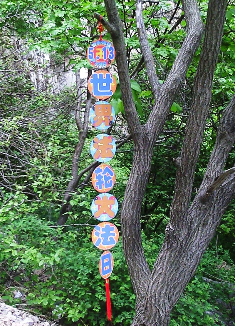 今年5月13清晨,东北某市的街道两侧树上、公园里、农村的公路两侧树上、桥栏杆上、村屯里,到处都飘扬着“法轮大法好”,“天灭中共、三退保命”,“恭祝五•一三世界法轮大法日”的真相条幅,还有“普天同庆五•一三世界法轮大法日”的横幅。建筑物上、墙上贴有“庆祝5•13法轮大法日”、“法办周永康”等真相图片,在乡村、在集市上缓缓飘过带有“法轮大法好”和“恭祝五•一三世界法轮大法日”真相条幅的氢气球。大法弟子感谢师尊救度之恩,以各种方式向世人,救度众生。