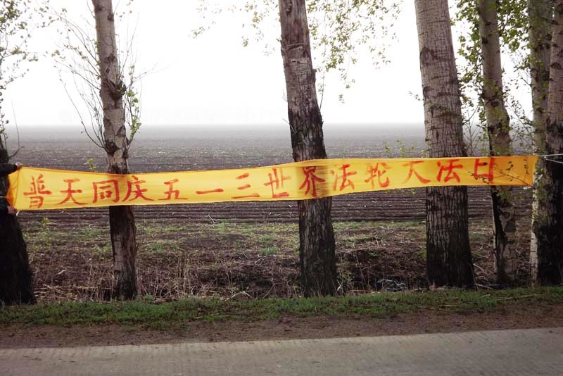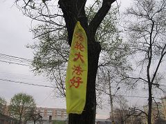 【明慧网二零一二年五月十五日】五月十三日是世界法轮大法日,今年的五月十三日标志着法轮大法洪传于世二十周年,大陆大法弟子以各种方式纪念这个神圣美好的日子,其中包括“挂条幅”。