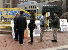 有一位新闻学院的学生得知法轮大法学员在大陆被酷刑折磨的事实后,仔细看了每块展板,说他回去后会按照传单上的网址去学习法轮大法。