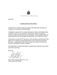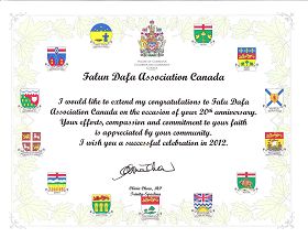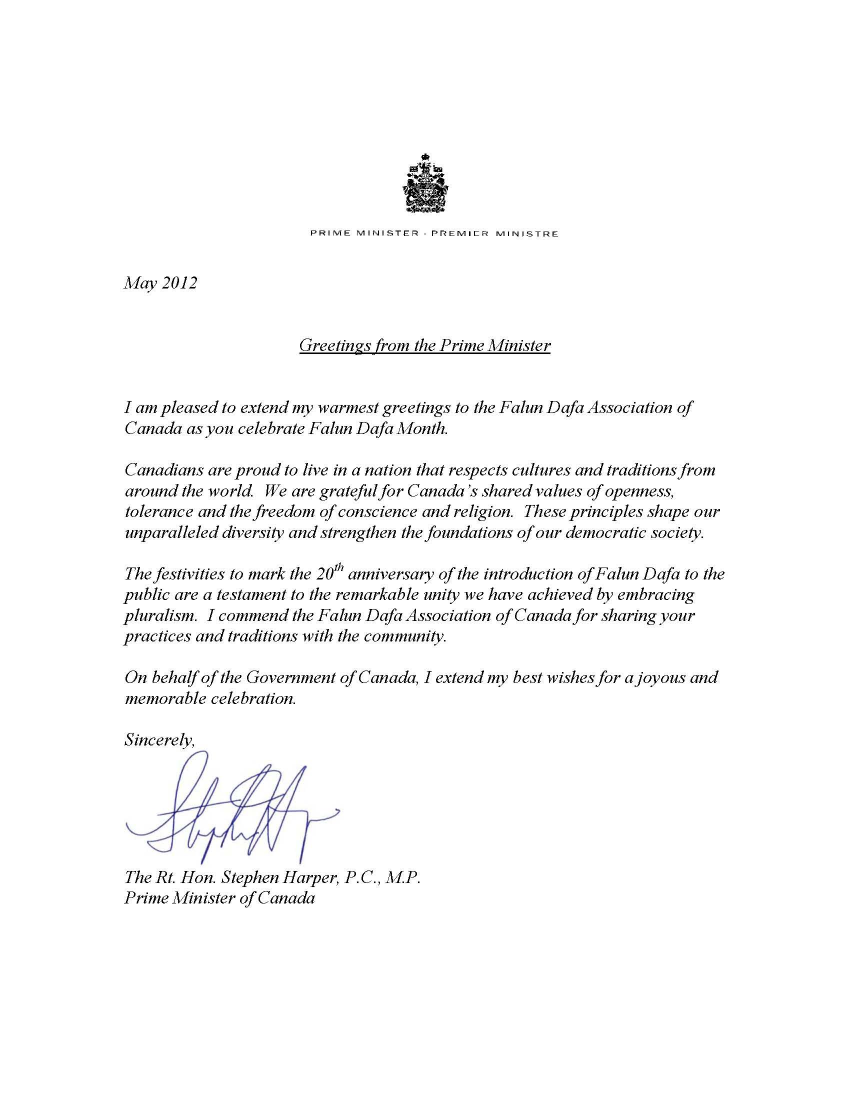 【明慧网二零一二年五月四日】(明慧记者加拿大报道)法轮大法自一九九二年五月十三日在中国传出,二十年来已经弘传世界一百多个国家,无数世人因修炼法轮大法身心受益。二零一二年五月十三日是世界法轮大法日,加拿大总理哈珀(Stephen Harper)与部长等政要给法轮大法学会发出贺信,称赞法轮功对社会作出的贡献,这是哈珀总理连续第七年发出贺信。