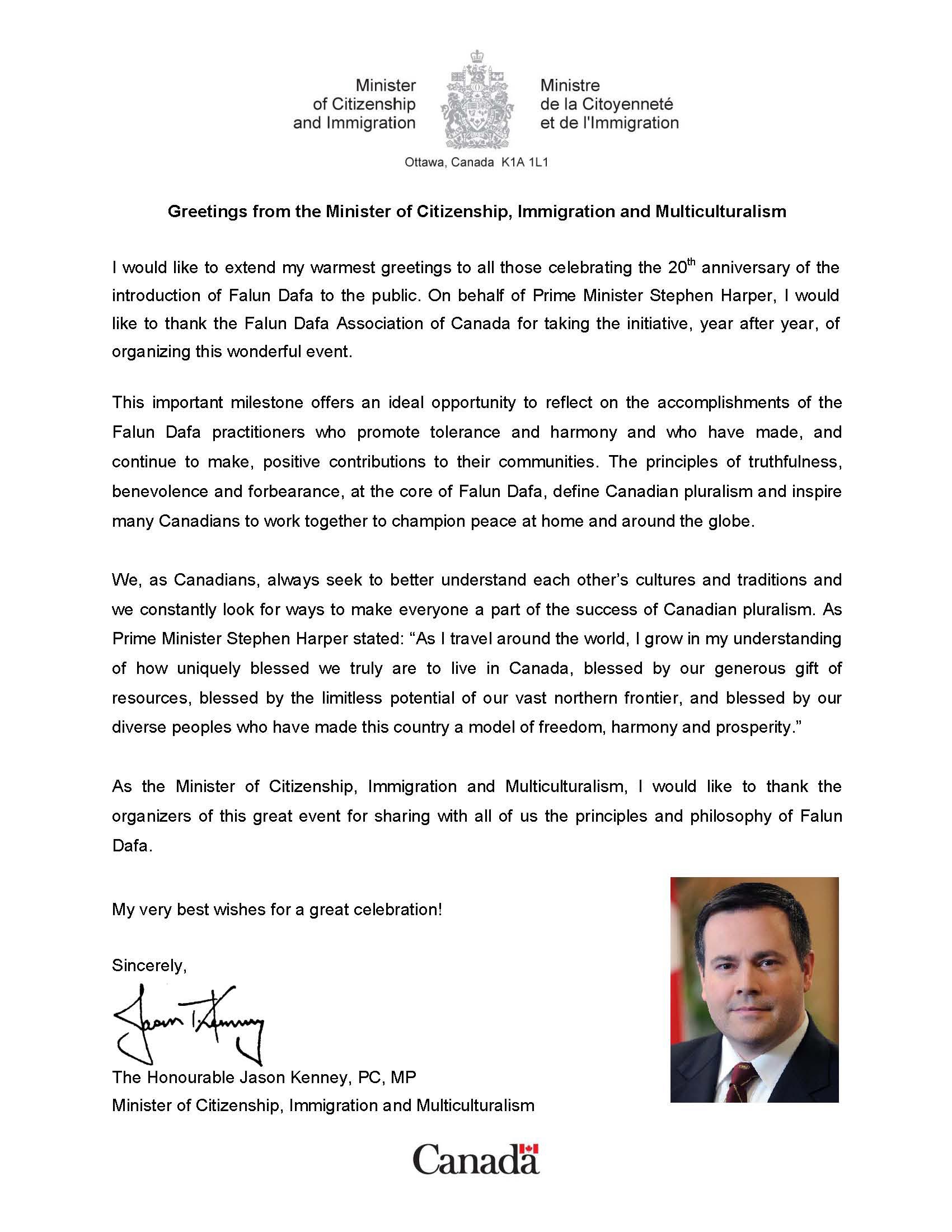 加拿大公民、移民及多元文化部长、内阁运作委员会主席肯尼(Jason Kenney)在贺信中说:“我要向‘法轮大法传世二十周年庆祝活动’所有参与者致以最诚挚的问候。代表总理哈珀,我要感谢加拿大法轮大法学会坚持不懈地举办这一年一度的美好庆典。