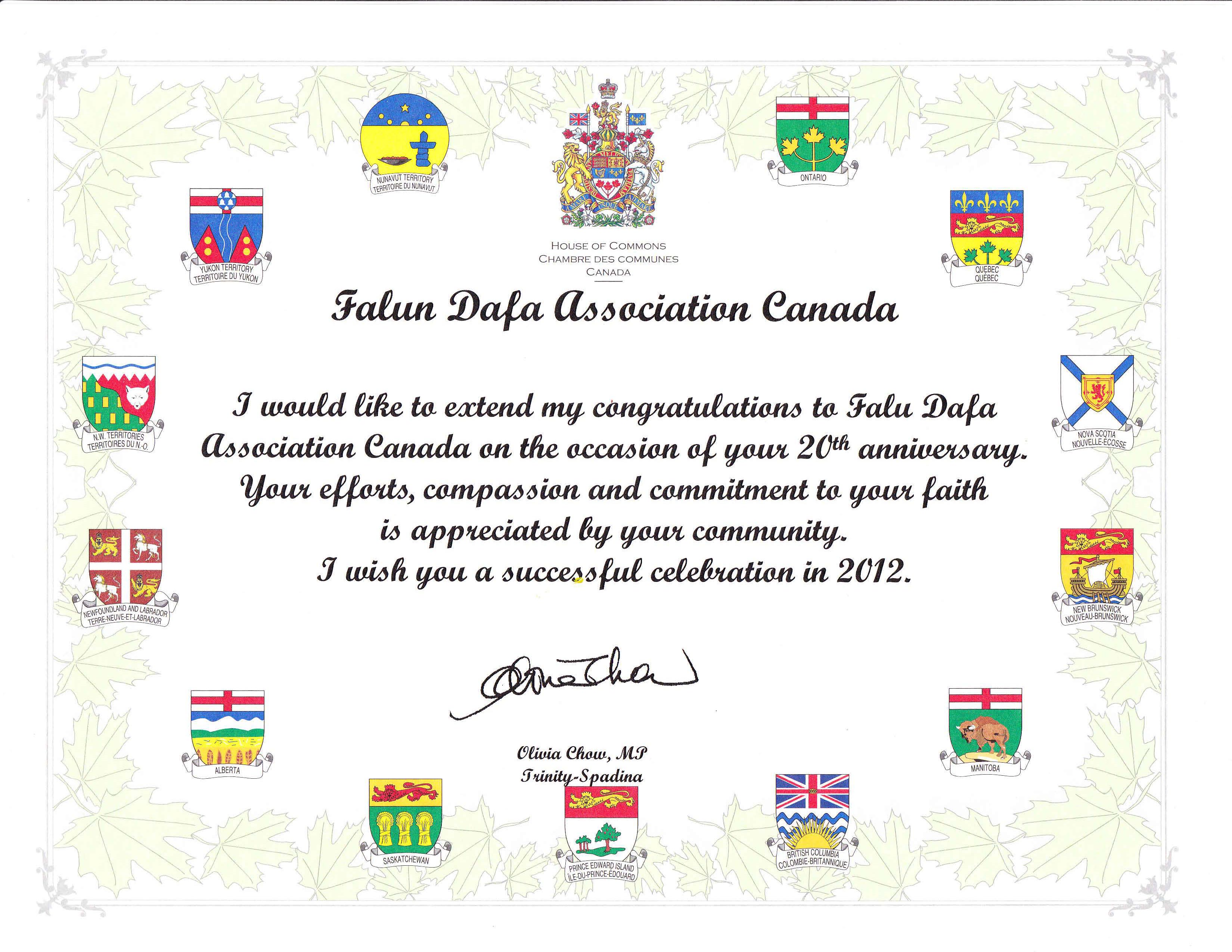 国会议员司维特(David Sweet)在贺信中说:“我向你们坚持真、善、忍的原则表示敬意。这也使我自豪:我是一个加拿大人,我们的社区因分享你们的传统、信念和宽容而富足。”