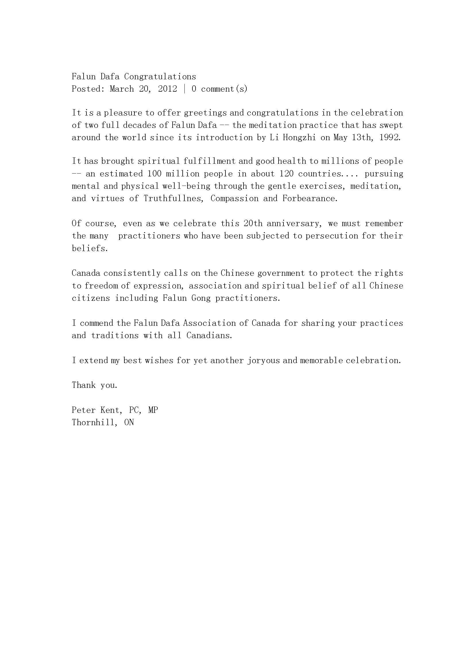 加拿大环境部长肯特(Peter Kent)今年三月二十日起在其个人网站首页刊登贺词,庆祝法轮大法弘传世界,使人身心受益。