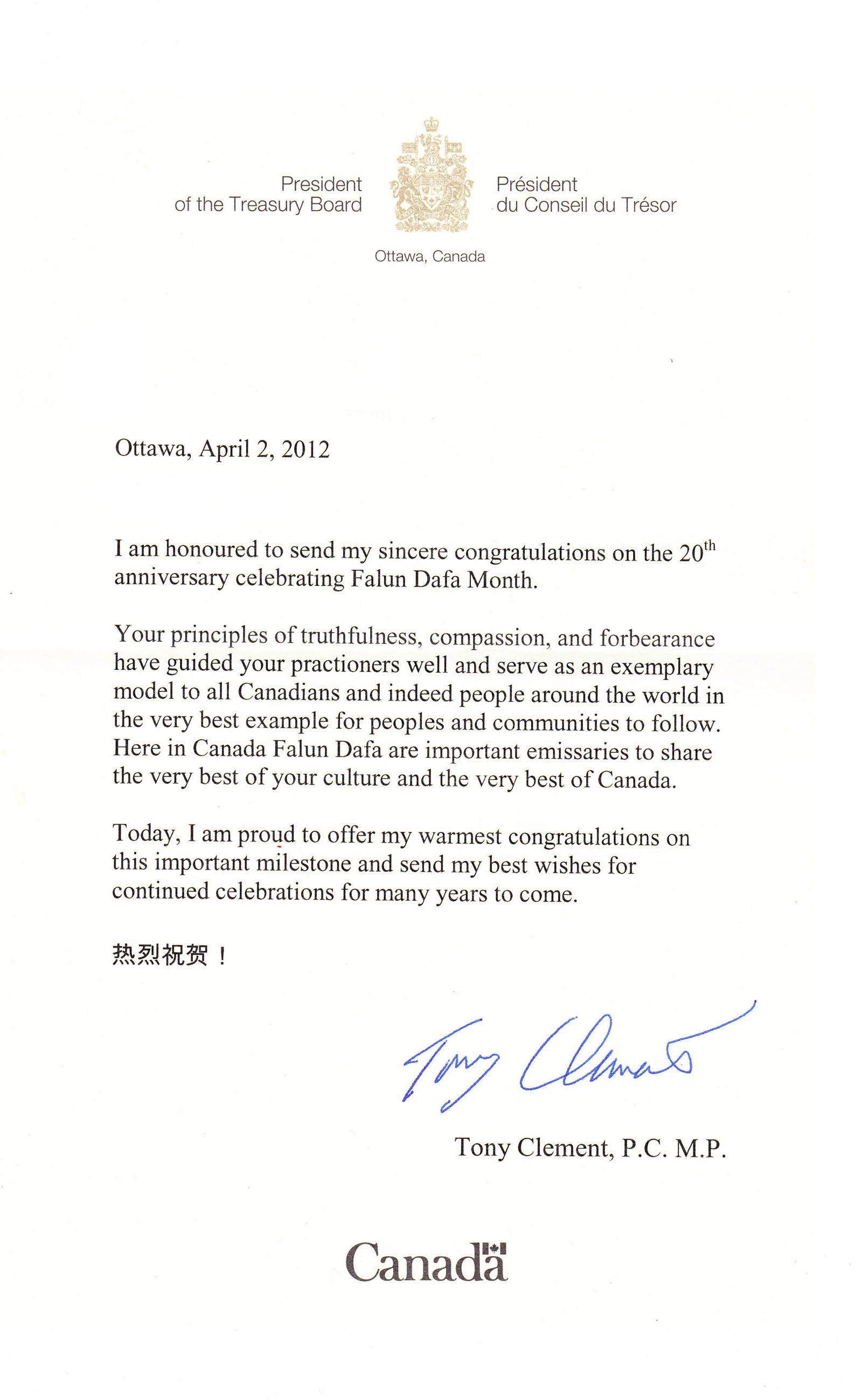 联邦国库主席甘礼民(Tony Clement)在贺信中说:“真、善、忍的原则指引着法轮功学员的修炼。你们是所有加拿大人,甚至世界的各个民族和社区的最杰出的楷模。”