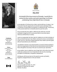 加拿大劳工部长蕾特(Lisa Raitt)在贺词中说:“自从一九九二年李洪志先生传出法轮大法至今,法轮大法一直在宣扬着和平、宽容与和谐的理念,这在世界各地广为人知。”