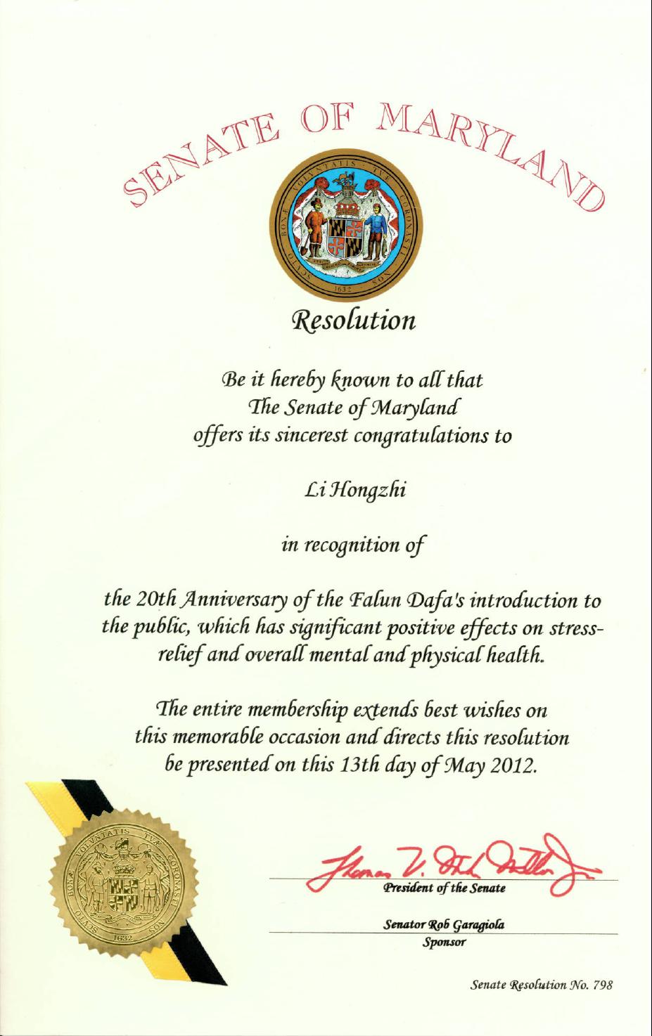 马里兰州参议院向李洪志先生致以最诚挚的祝贺,表彰法轮大法洪传二十周年,对身心的全面健康和减轻压力有积极正面的效果。