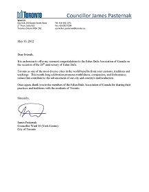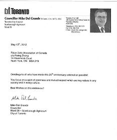 多伦多这个世界上最多元化的城市之一受益与你们的传统和指导理念。这个长达一个月的庆典弘扬着真善忍的价值观,这样的价值观为我们多元城市-以致多元国家的发展进步做出了贡献。再次感谢加拿大法轮大法协会的成员和多伦多居民分享他们的修炼和理念。 ”