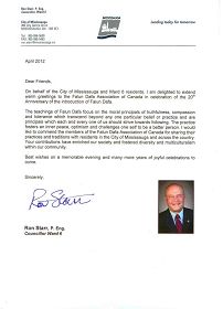 密西沙加第六区市议员Ron Starr在贺信中说:“在法轮大法传世20周年庆典之际,我很高兴的代表米西沙家市和第6市选区的居民们,向加拿大法轮大法协会致以热烈的祝贺。