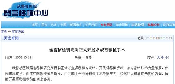 102、《武警总医院器官移植研究所网站》2005年10月18日报道,2012年4月28日收录