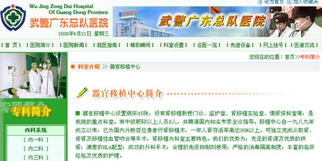106、《武警广东总队医院网》2006年6月21日收录“器官移植中心简介”