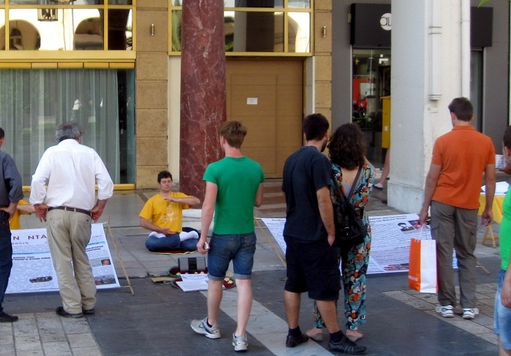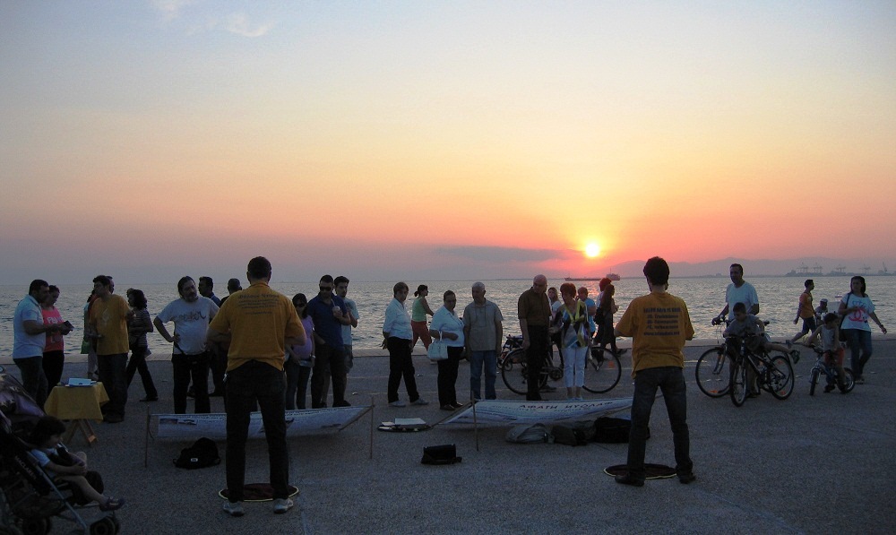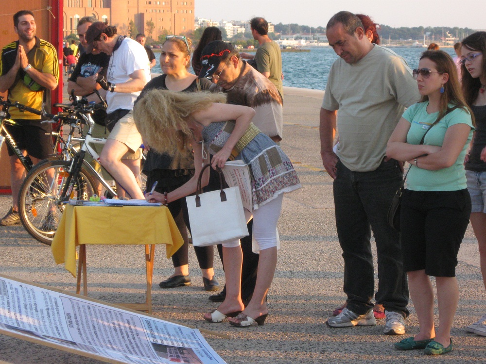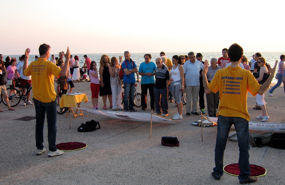 因希腊白天的气温在35~40度,所以白天街上不见人,法轮功学员一般在傍晚之后于萨洛尼卡市新海滩上举办信息日。功法演示和优美的音乐吸引着很多在沿海散步的当地民众。前来了解真相的人们纷纷驻足观看真相横幅,一些学员散发传单并讲真相;不少年轻人对功法演示非常感兴趣,当场就跟着学炼。许多人询问在哪里可以找到炼功点。