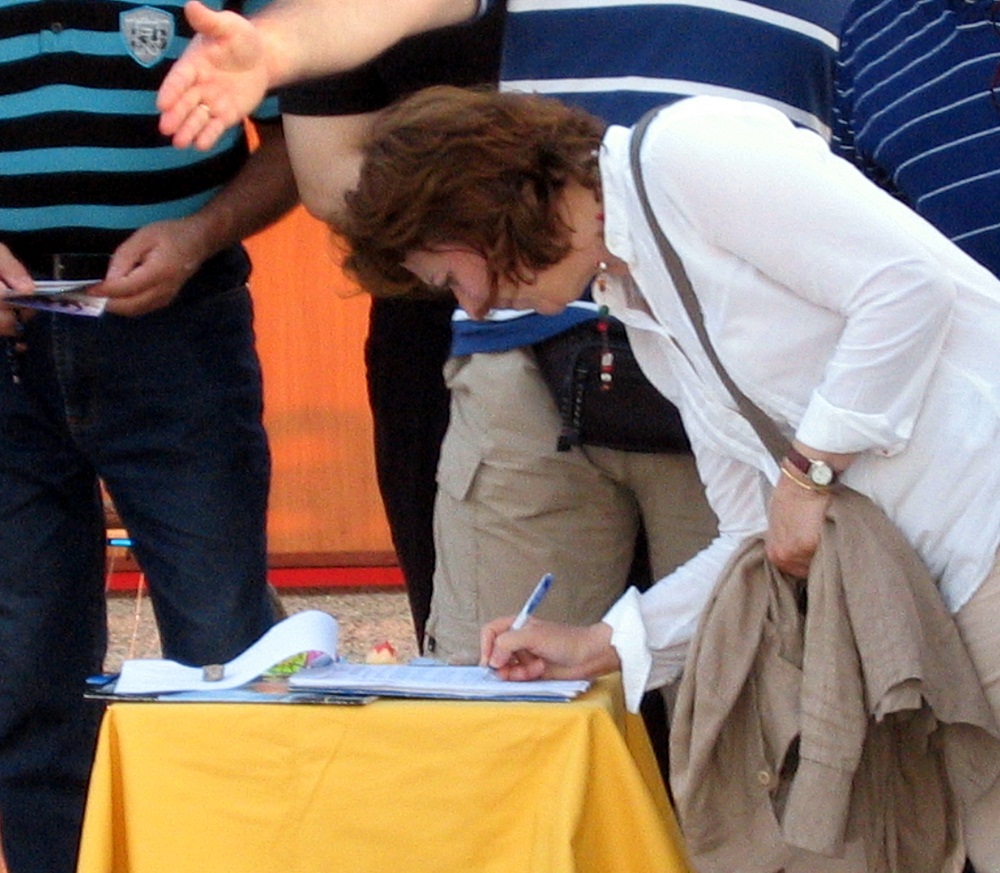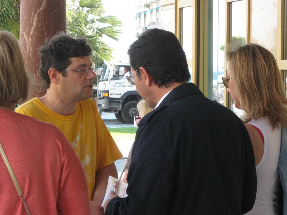 下午四点左右,希腊三大政党之一的新民主党主席康斯坦丁•格欧勒卡斯(Constantine Gioulekas)路过市中心的洪法点时,一位学员过去给他和他的一行人讲真相,递给他们相关资料。格欧勒卡斯说他没听说过法轮功,当他和他的一行人了解到中共还在残酷迫害法轮功,感到很吃惊。其中的一位女士问怎么才能帮助被迫害的法轮功学员?学员建议他们可以签名反迫害或者在网站上签名表示自己的态度,他们欣然同意上网去签名。