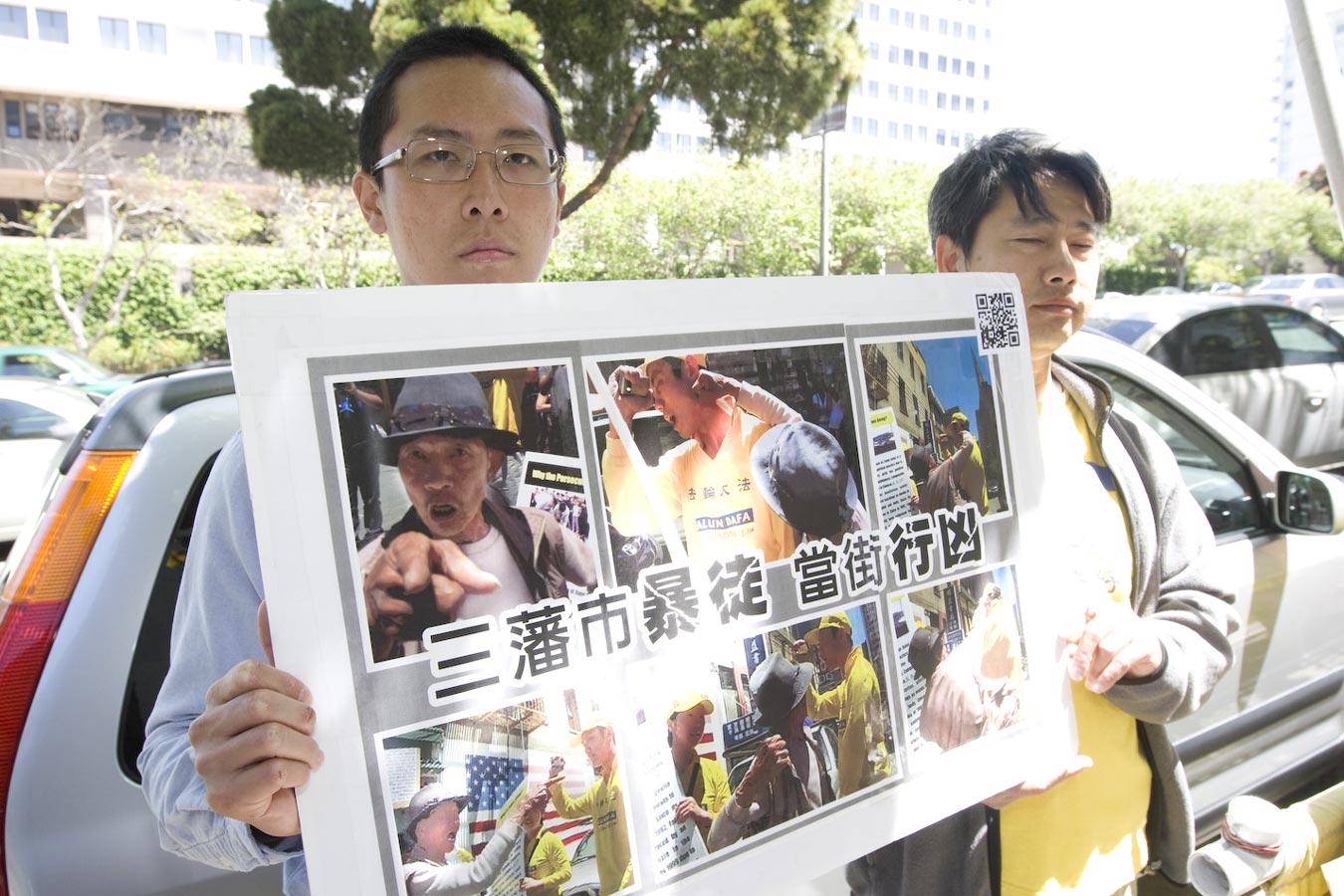 ![]() 旧金山学员在中领馆前集会,揭露和抗议中共输出迫害,煽动华人对法轮功的仇恨。 |