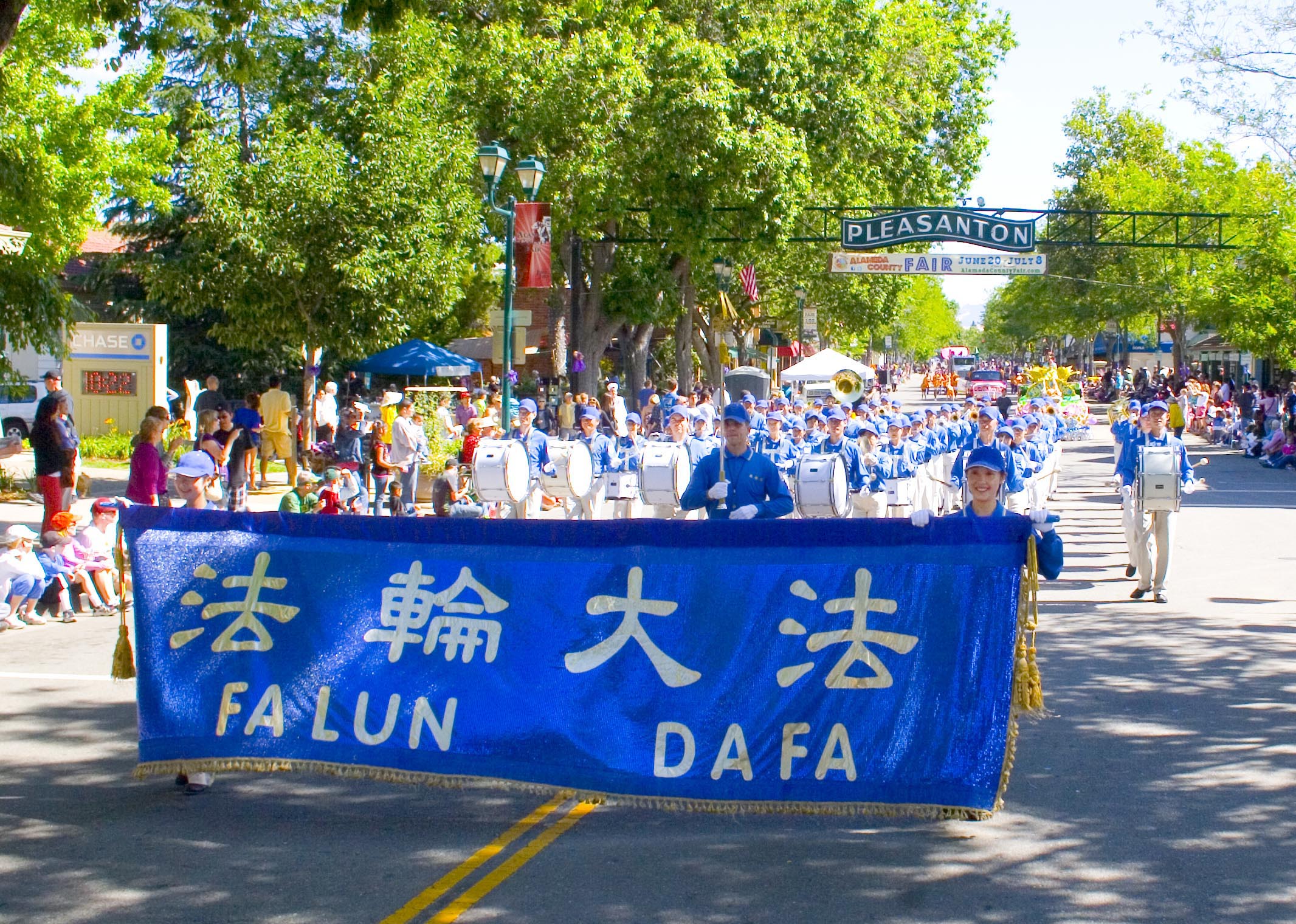 这是法轮功学员第二次参加阿拉米达县园游会游行。他们祥和的笑容、明亮的服装、整齐的步伐、雄壮的乐曲和美丽的花车,受到人们的欢迎。