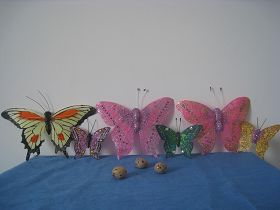 蝴蝶 (先挑选已经染过色的羽毛,粘在宽透明胶带上,然后盖上翅膀形状的戳,再把翅膀剪下来,有的要用毛笔蘸水彩画出图案,有的需要刷白胶蘸上各种颜色的金粉,有的需要粘上各种颜色的珠子;蝴蝶身子是模具做出的泡沫,先用剪子或刀片磨平,然后兑上黑漆及白胶涂上颜色,晾干之后,用烙铁在两侧烫出插翅膀的缝隙,再用针在头部扎两个眼儿,插上塑料做的触须,用白色涂上眼睛,再用翅膀蘸上胶水插进身子)