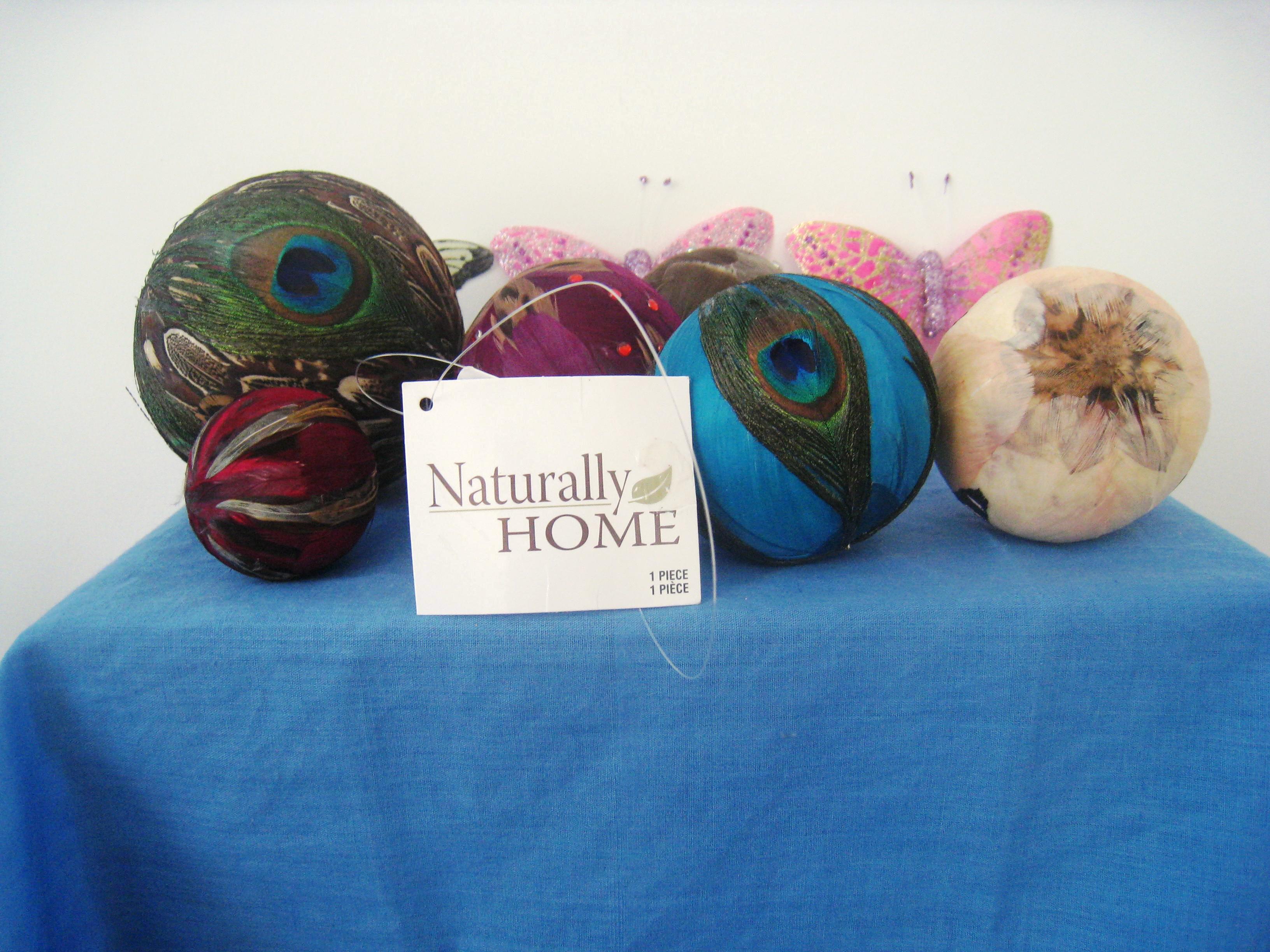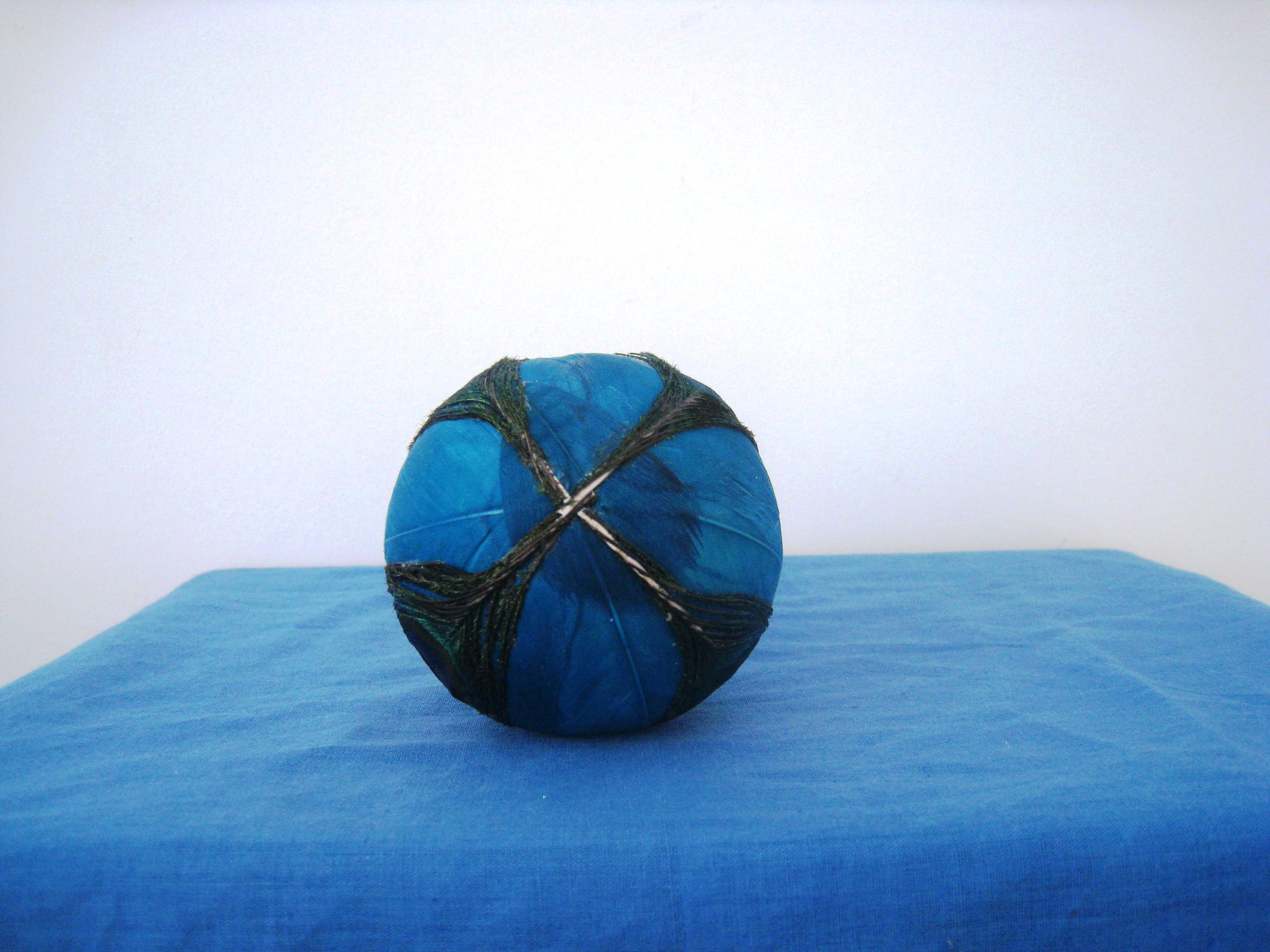 ![]() 孔雀翎球直径约10cm(制作第一步是把白色泡沫做的圆球去掉多余部分,磨平,然后涂上黄胶,把染上蓝色的可能是鹅毛粘在球上,再把四个孔雀毛涂上胶粘上) |
