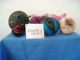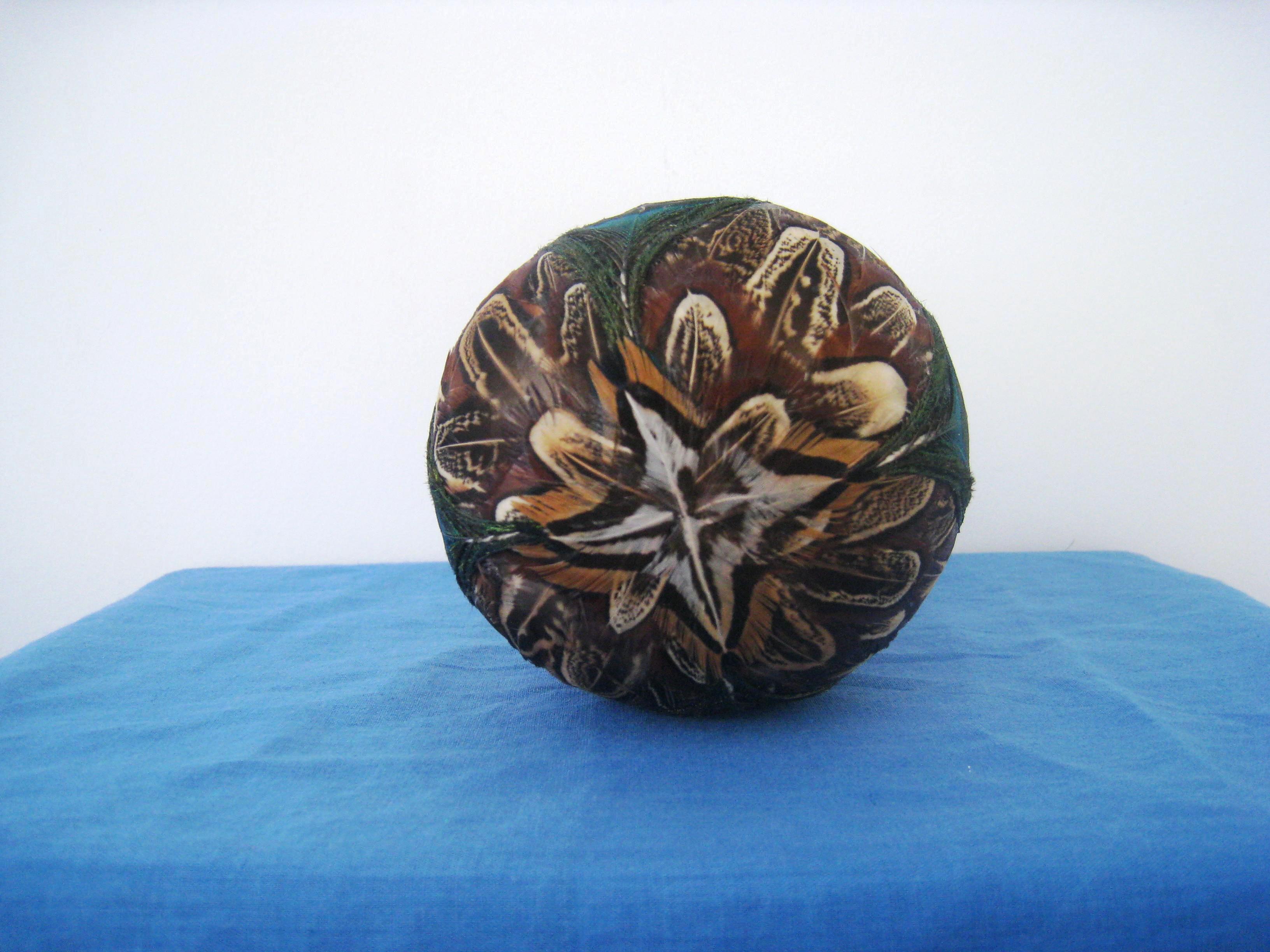 ![]() 孔雀翎球 直径约10cm (制作程序同上,只是把孔雀翎下面的大鹅毛改成鸡毛) |