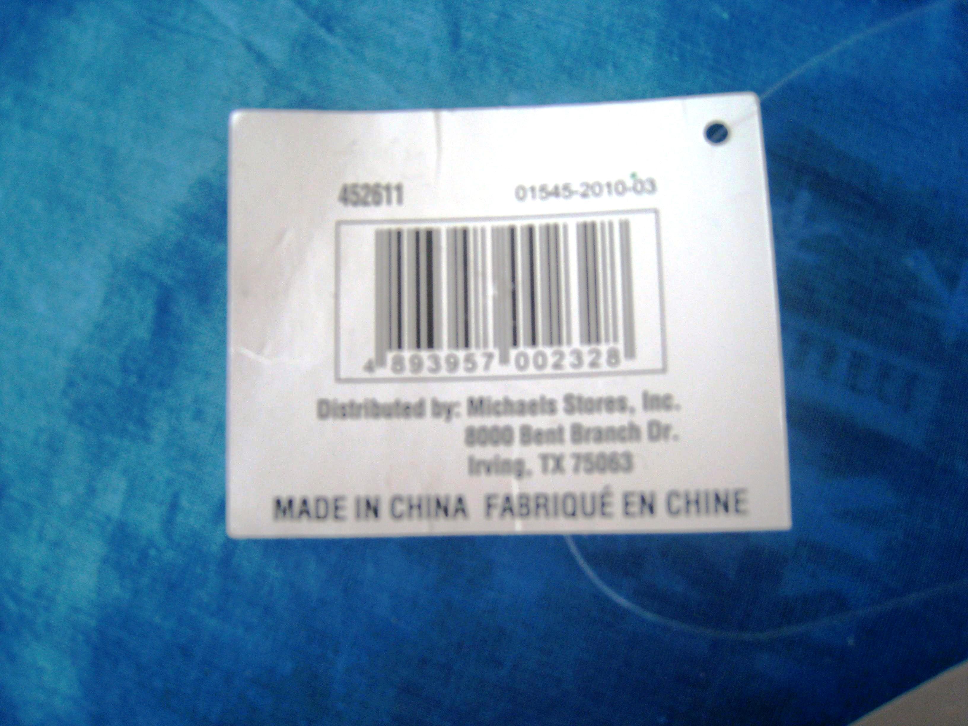 ![]() 用于产品包装的标签 | ![]() 这是左图标签的背面,该图上的小字为:Distributed by: Michaels Stores, Inc.,8000 Bent Branch Dr.,Irving, TX 75063 |