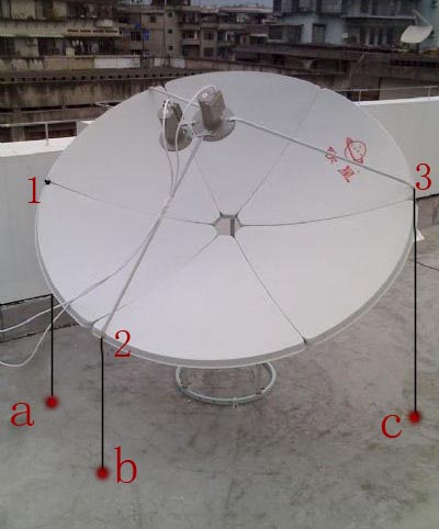 安装在楼顶的卫星接收器经常因大风被吹得偏离方向,即使固定的很好也有此现象出现,从而接收不到信号,为了解决此问题,可以这么做,当在无风的天气,把卫星接收器调整到最佳接收信号的位置,然后在接收器的三个位置(1、2、3的位置点)上拴上细线,细线下方可拴一个小螺母,正好下垂到地面a、b、c的位置上,不能长也不短,在a、b、c的位置上可用油漆画三个点,作为标记。当刮风收不到信号时,无风时再转动卫星接收器位置,使1、2、3的位置点下垂线对上a、b、c三个点就可以了,我用过此方,效果不错, a、b、c三个点也决定了1、2、3的位置不变,三点决定一平面。