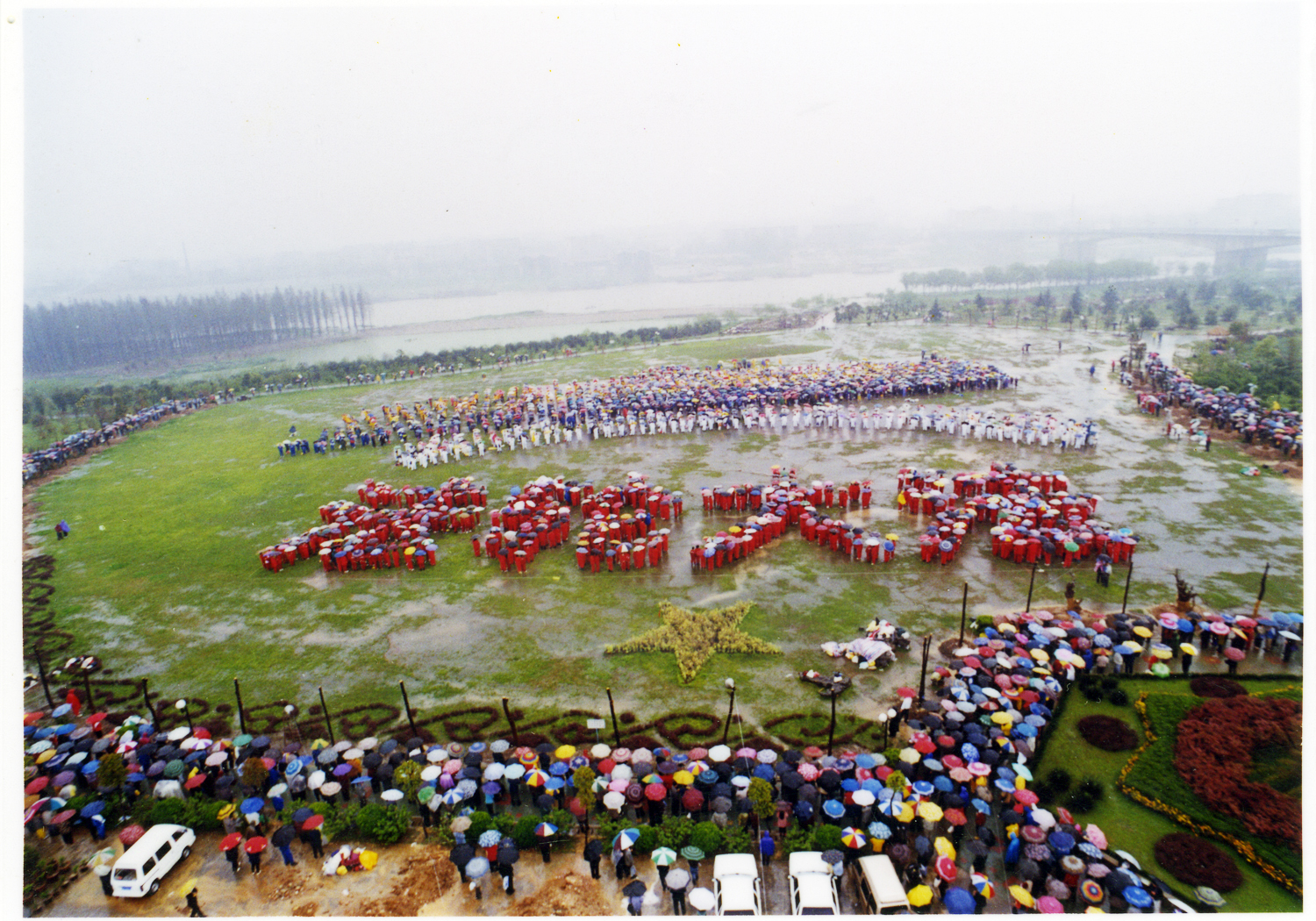 武汉的大法弟子都不会忘记一九九九年四月十一日那次雨中法会。这次法会,是在汉阳的汉水公园举行的,大约有七千名学员参加了这次法会。这是一个新修建不久的临江公园,环境幽静,公园中间有一大块绿草坪,学员们就准备在这块草坪上排“法轮大法”四个大字。