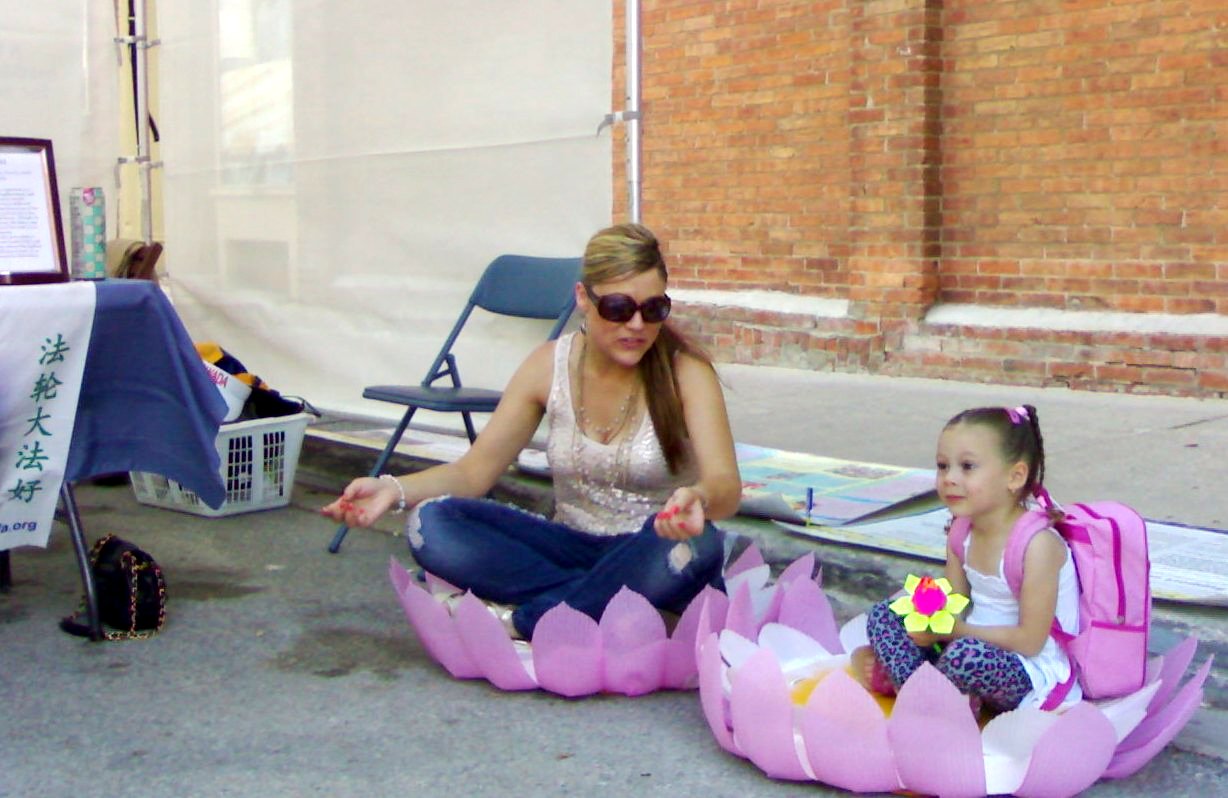 年轻的母亲克里斯汀(Christeen)和她的女儿也是连续两天都来到法轮功展位前。她们很喜欢学员折的纸莲花。她还说能感受到学员散发出的很纯正的能量。她的女儿更是不愿离开展位,直到学员们拆帐篷时,这个可爱的五岁小姑娘还问她能不能帮忙。