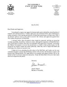 我坚定地相信所有的精神追求都应该得到尊重,任何和平的团体都不应该受到暴力压迫。虽然法轮大法的支持者遭受了大量的暴力(迫害),他们却没有任何暴力的回应。我希望中国当局不要把法轮功学员当作是对其政党的威胁,因为他们并没有任何寻求国家政治权力的意愿,他们只是以一种积极的方式寻求健康和幸福的公民。