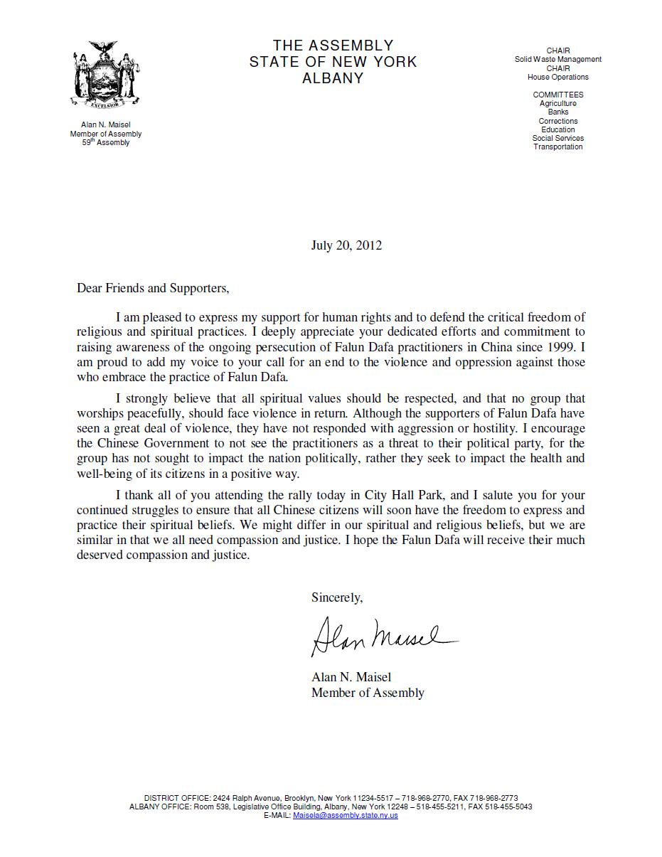我很高兴能表达我对人权和捍卫宗教和信仰自由的支持。我深深地赞赏你们为了停止中共自一九九九年开始的对法轮大法学员的迫害所作出的不懈努力和付出。我很自豪能加入你们的呼吁制止对法轮大法学员的迫害和压制。