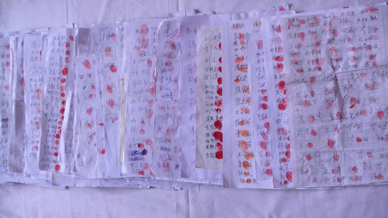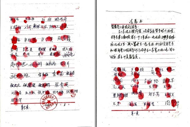![]() 黑龙江省有超过一万五千民众为素不相识的法轮功学员挺身而出,在替父鸣冤的秦荣倩的《喊冤昭雪书》上签名并按上大红手印 |