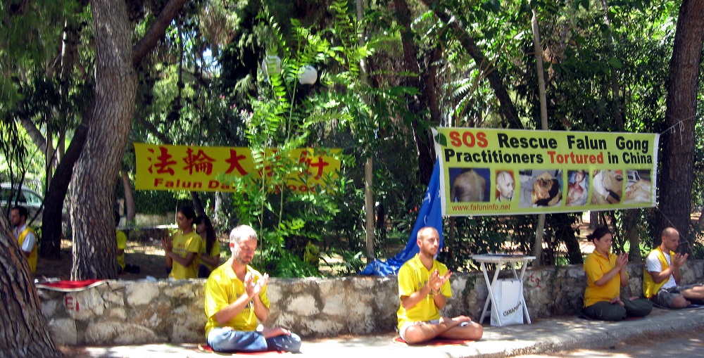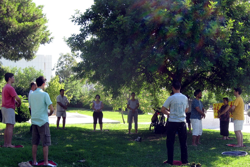 ![]() 法轮功学员在雅典市中心中央广场附近的公园炼功 |