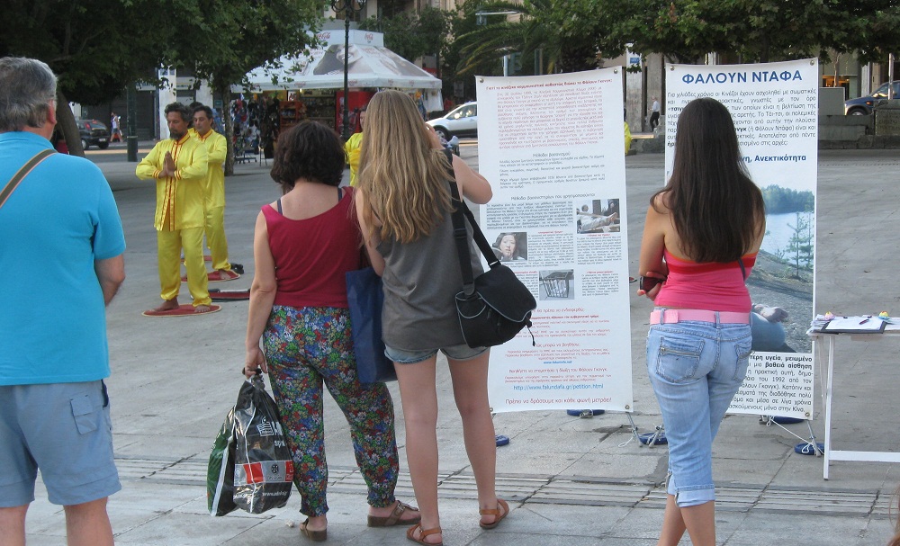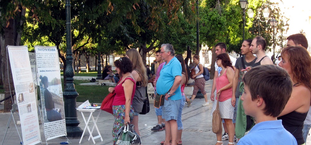 ![]() 游客在雅典市中心中央广场阅读法轮功真相展板 |