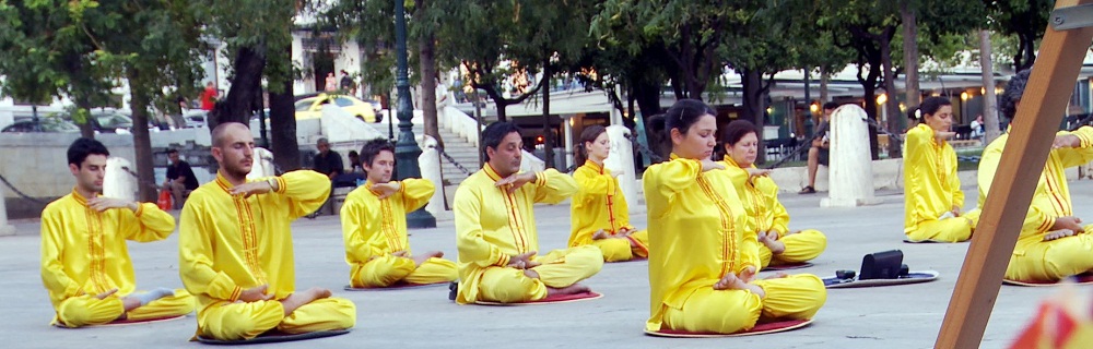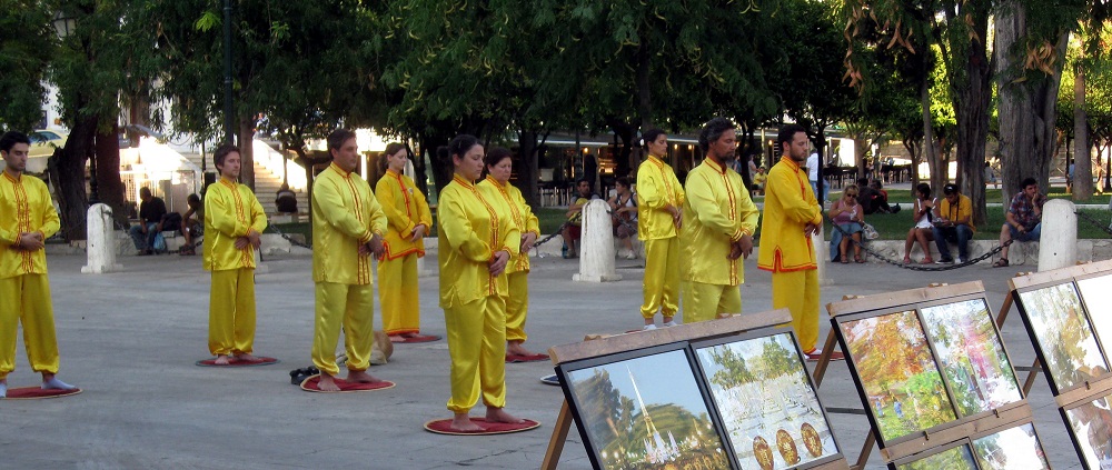 ![]() 法轮功学员在雅典市中心中央广场上演示功法 |