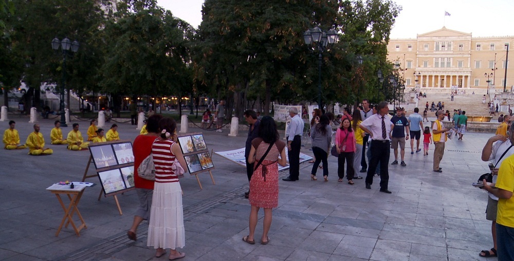 七月二十一日晚七点半至十点半,学员在雅典市中心希腊议会大厦前的中央广场Syntagma 上讲真相反迫害。这里是希腊最繁华、游人最多的地方。