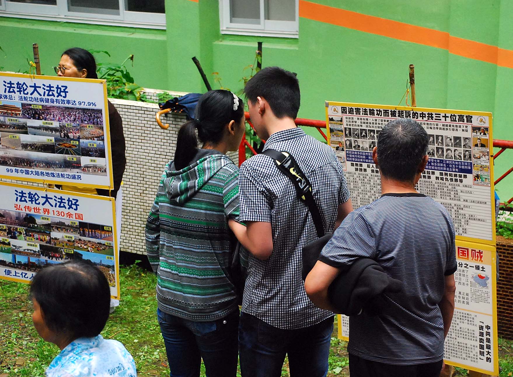 ![]() 大陆游客认真阅读法轮功真相看板 |