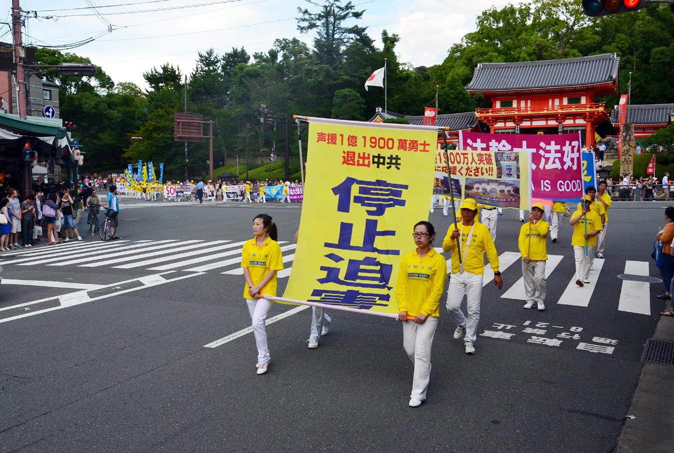 十五日,法轮功学员在京都举行游行。位于京都府京都市东山区的八坂神社,是日本全国约三千座八坂神社之总本社,通称祇园。京都祇园祭是日本最大规模、最著名的盛典,整个祭奠长达一个月之久。法轮功学员是第一次在祇园祭期间举办游行。当游行队伍经过八坂神社时,四面的游人驻足观望。