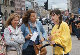 展板前一位南欧的女学生把包放在地上,闭着眼睛静静地站着。后来她对学员说,她从小就比一般人能感受到的东西多,她觉得这里的场非常舒服,并询问阿姆斯特丹的炼功点,想要学法轮功。了解到中国法轮功学员在这场迫害中的遭遇后,她流下了眼泪。