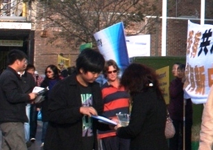 法轮功学员梅瑞(Merry)告诉记者:“一些有素养的华人跑过来对我说:‘我签字支持你们。记住,中共是最坏的,我最恨它!’还有个华人跑过来问:‘什么时候中共灭亡哪?快一点啊!我们巴不得它快点灭亡,你们法轮功加油啊!’另外一个华人跑过来主动签名后还说:‘你们以前没有这么多人在这里,请你们以后多来,让我们多来看看多了解一点,这是一道风景线啊!’”