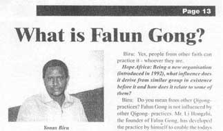 来自非洲更重要的报道,出现在《希望非洲报》(Hope Africa)上。发行量横跨欧非两大洲的希望非洲报,在2005年出版的第五期上,刊登了记者采访非洲法轮功学员尤纳斯•毕鲁(Yonas Biru)的文章,题目是《什么是法轮功?》。(图四)以下是采访内容的一部份: