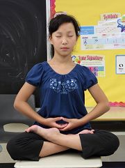 刚从大陆来的小弟子辰辰,今年十岁。她说:“听妈妈说,我一岁多的时候她就带我读《转法轮》,五岁多的时候就完全能自己把《转法轮》读下来了。四岁时抱轮能炼半个小时,但随着我年龄的增长,就坚持不下来。但后来到明慧学校多炼功就能坚持到那么长时间了。”