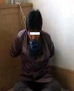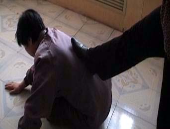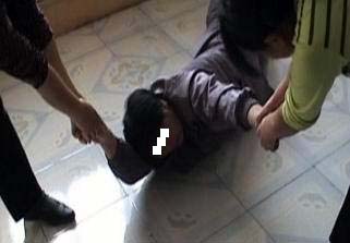 恶警黄海雁和几个转化者在队长寝室把我高吊,只能脚尖着地,时间一长我痛苦得承受到极点。于是拿出布带把我的双腿强行盘上后捆紧,把我的左手拧过去和右手铐在一起,把我的脖子用布带缠紧摁着头绑在双腿上,想抬头都抬不起,时间一长两脚发黑,疼痛难忍。