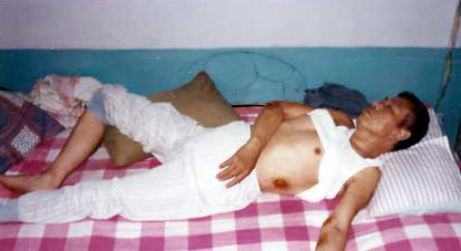 据目击者说,李树忠已经处于昏迷,身体瘦弱不堪,李树忠的双脚还带着双脚镣,灌食的胃管24小时插着长期不拔出来,并给带着口罩加重迫害。在这样的情况下北票市国保大队置人道于不顾,仍然坚持要李树忠出庭。十一月十三日,恶党不法人员无视法律和职业道德,在没有通知家属的情况下,将处于昏迷状态的李树忠从医院强行抬到法院,秘密开庭宣判李树忠五年徒刑,历时不到十分钟,草草将李树忠非法判刑五年。