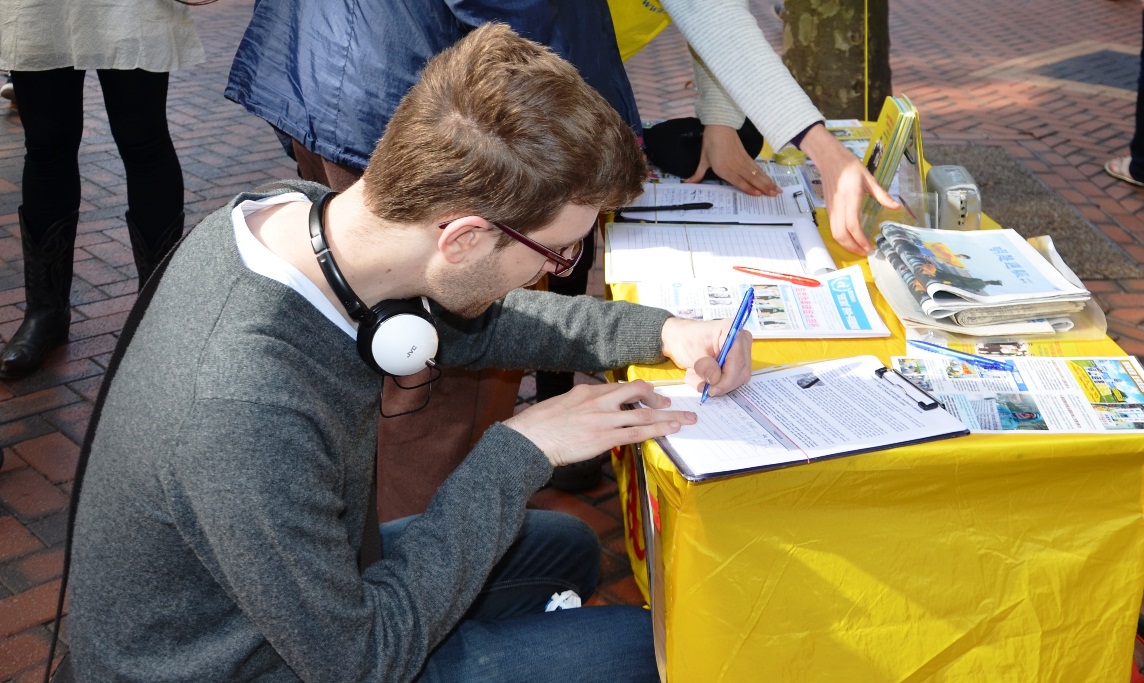 签名的民众中,有一位年轻女士是看到横幅就径直走到桌前问:你们的征签表在哪里?这位女士来自波兰,名叫阿妮嘉(Alicja),她表示几年前就听说过法轮功在中国遭受迫害的事。她说,之前,她在波兰和英国都遇到法轮功学员讲真相的活动,每一次遇到她都会再签一次名,以表示支持。谈到中共摘取法轮功学员人体器官贩卖谋利的暴行,阿妮嘉眼泛泪光。她说,波兰以前在苏联的阴影之下,也是共产国家,所以她了解共产党的本性。她对学员说,你们举行这样的活动很好。你们是在增进人们的意识,越多人了解这场迫害,正义的力量就越大。“希望所有的人都来签名!”她说。
