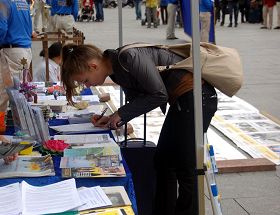 ![]() 人们纷纷驻足签名支持法轮功学员反迫害 |