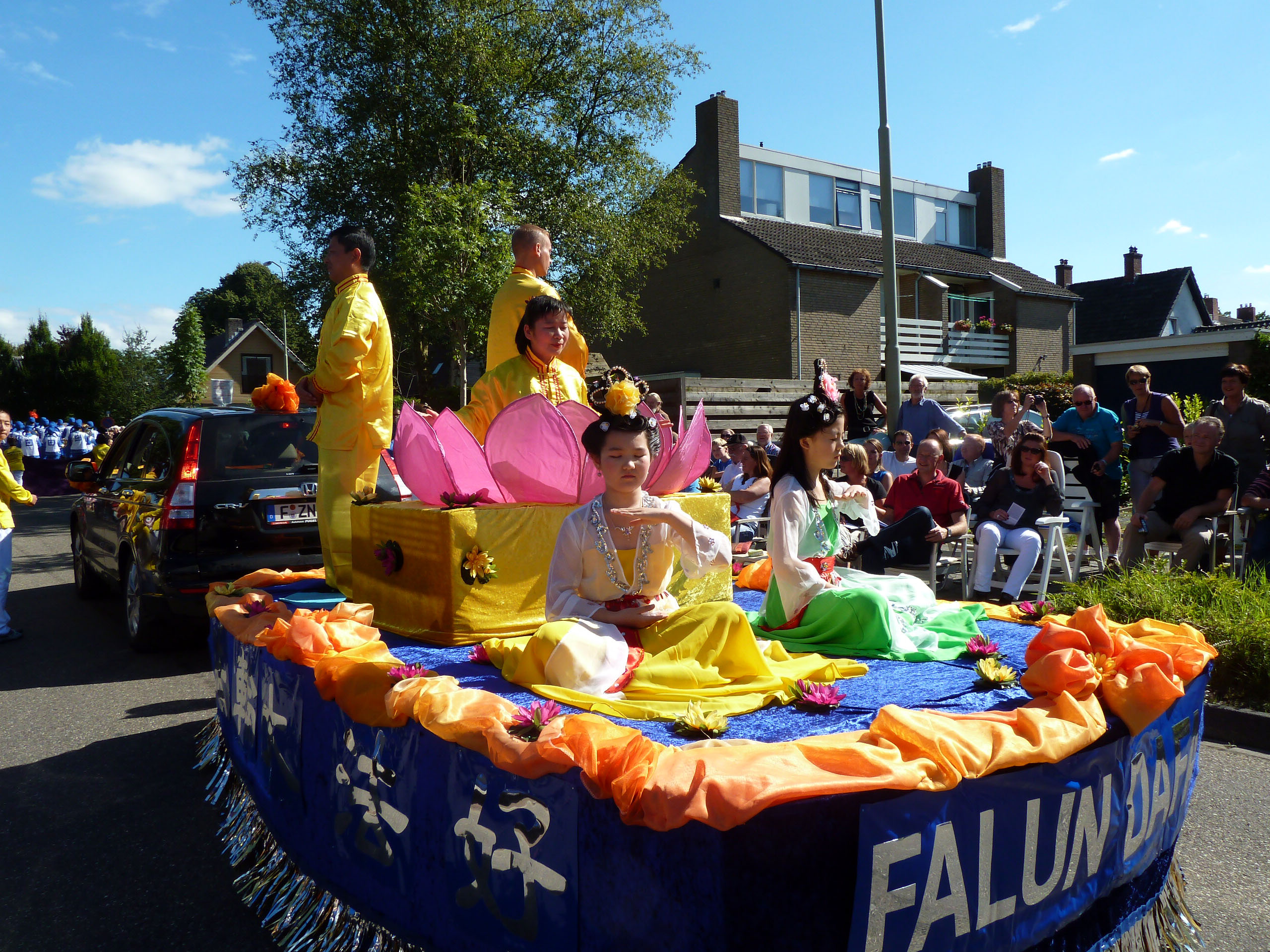 ![]() 艾尔德鲜花节游行中,法轮功学员在花车上演示功法 |