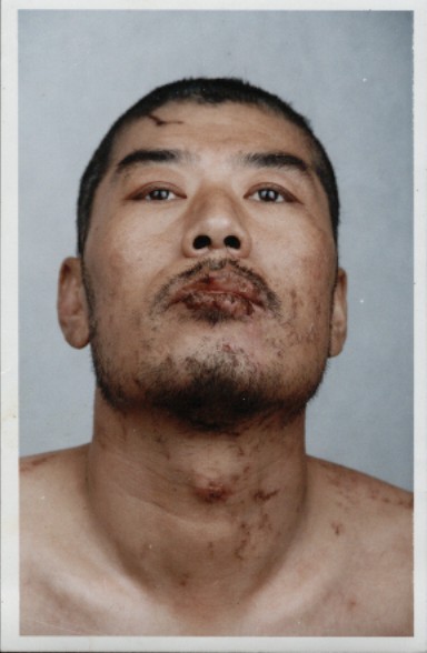 李福军一拳击在我的腮处,穿着皮鞋一顿猛踢、猛踹,拳头雨点一般。我被打得蹲在地上,他抬脚用鞋后跟往我背上砸。他把我拽到走廊中让我做“飞机式”,他用脚踢我还不解恨,便用膝盖顶我大腿肌肉两侧,肌肉都肿了,走路困难,疼痛难忍,抬脚往我背上砸,搬着我的脑袋往墙上撞,用膝盖顶我大腿,疼得我喘不过气来,我额头上豆大的汗珠往下掉。管教是个年轻的叫贺军,他把我拽起来,抬起手来一顿嘴巴,左右开弓,打得山响,然后他把我鞋脱下一只,手拎鞋跟后帮处用鞋底狠劲往我脸上打,普教们给我叫“变形金刚”,因为我的脸被打的确实变形了。