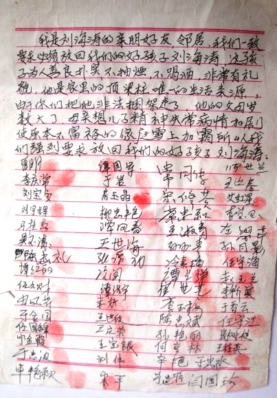刘海涛家所在村的村民同情这一家人的遭遇,曾经签名要求“必须放回我们的好孩子刘海涛”。眼看就要过年了,刘海涛父母只好向广大善良民众呼吁关注帮助,下面是他们的公开信。