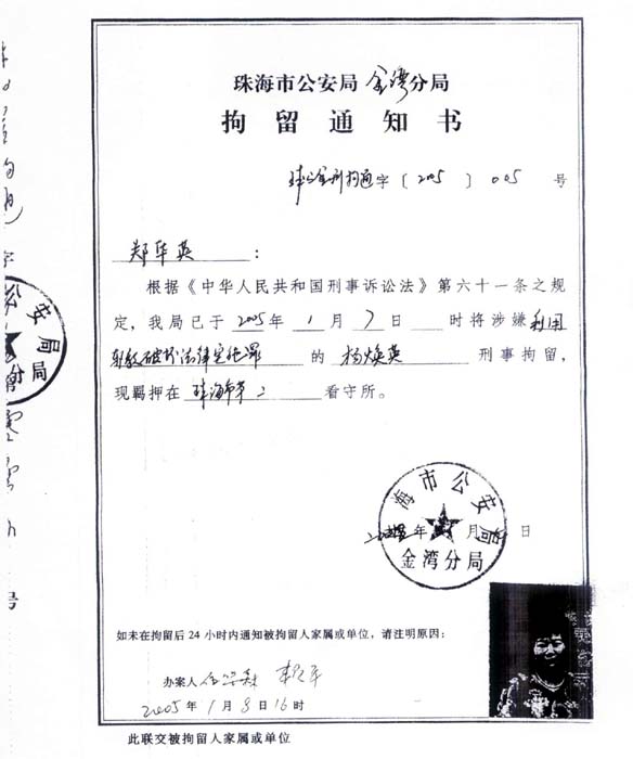 第九次,二零零八年一月三日被非法抄家,一月十八日上午九点,被绑架,送去井岸看守所、珠海二所都拒收,又送去市人民医院检查,回二所还是不收,折腾到下午五点多才放回家。过了几天又发来所谓“监视居住”的通知,全日监控。